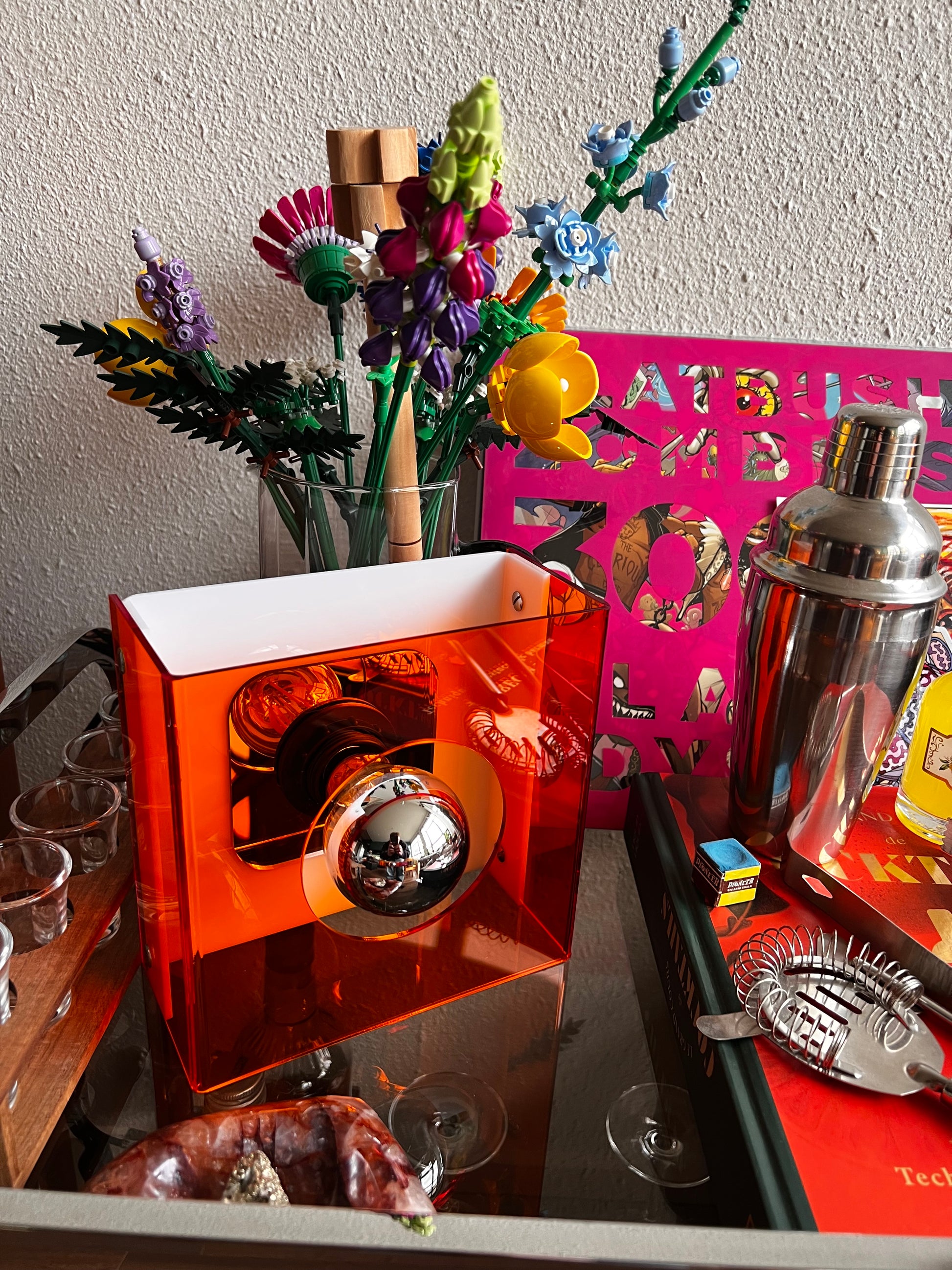 Inspirée du mouvement Space Age et du design rétro-futuriste des années 60–70, cette lampe rend hommage à une époque où la géométrie et la couleur évoquaient le futur.